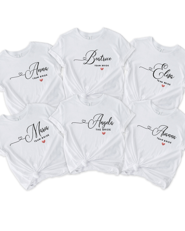 Se la tua missione è rendere straordinario un addio al nubilato, il nostro set di t-shirt coordinate “The Bride” e “Team Bride”, personalizzate con nomi e cuoricini, è quello che fa per te. Questo insieme non rappresenta solo un regalo perfetto, ma diventa l’elemento distintivo che impreziosisce l’evento, rendendolo indimenticabile.
