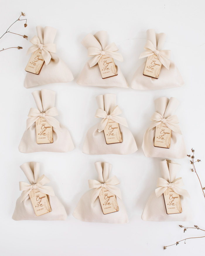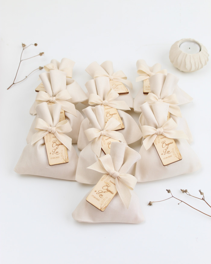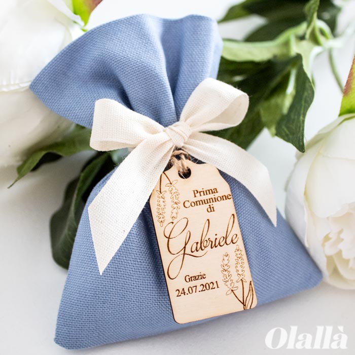 Delizioso sacchettino in cotone portaconfetti con etichetta in legno personalizzata. Ideale per realizzare una bomboniera di battesimo, comunione o cresima semplice ma elegante allo stesso tempo.