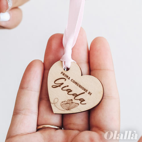 Tag in legno a forma di cuore e personalizzate con l’incisione del nome in stile calligrafico e della frase del tuo evento. Applicando queste etichette in legno, darai un tocco unico ed elegante alla tua bomboniera di battesimo, di comunione, di cresima o di nascita.