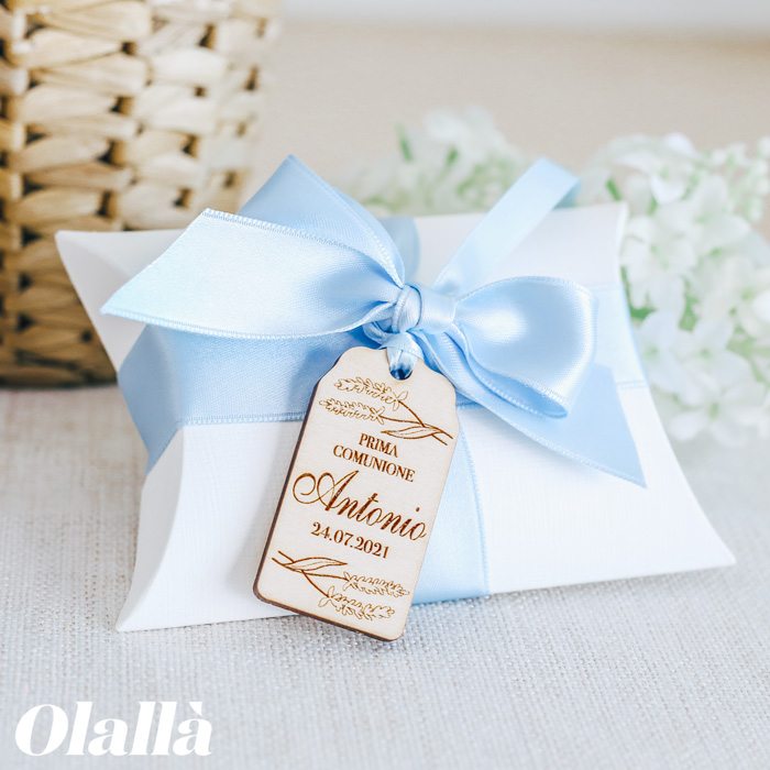 Tag intagliate nel legno e personalizzate con l’incisione del nome in stile calligrafico, frase e data del tuo evento. Perfette da applicare su scatoline porta confetti o per confezionare bomboniere di battesimo, comunione o cresima.