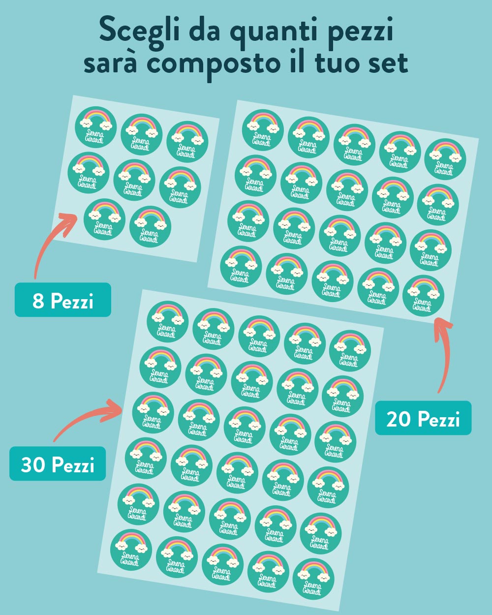3. Flessibilità nella Scelta del Set: puoi scegliere la quantità di etichette che meglio si adatta alle tue esigenze. Che tu abbia bisogno di un set da 8, 20 o 30 etichette, abbiamo la soluzione perfetta per te e il tuo bambino.
