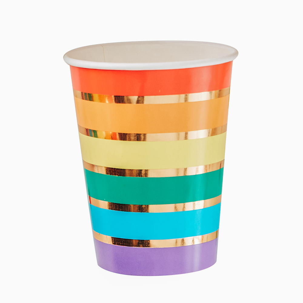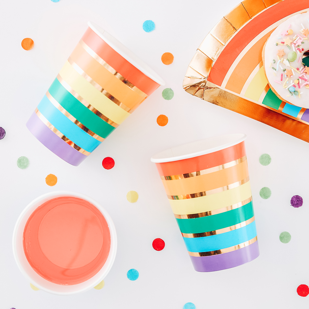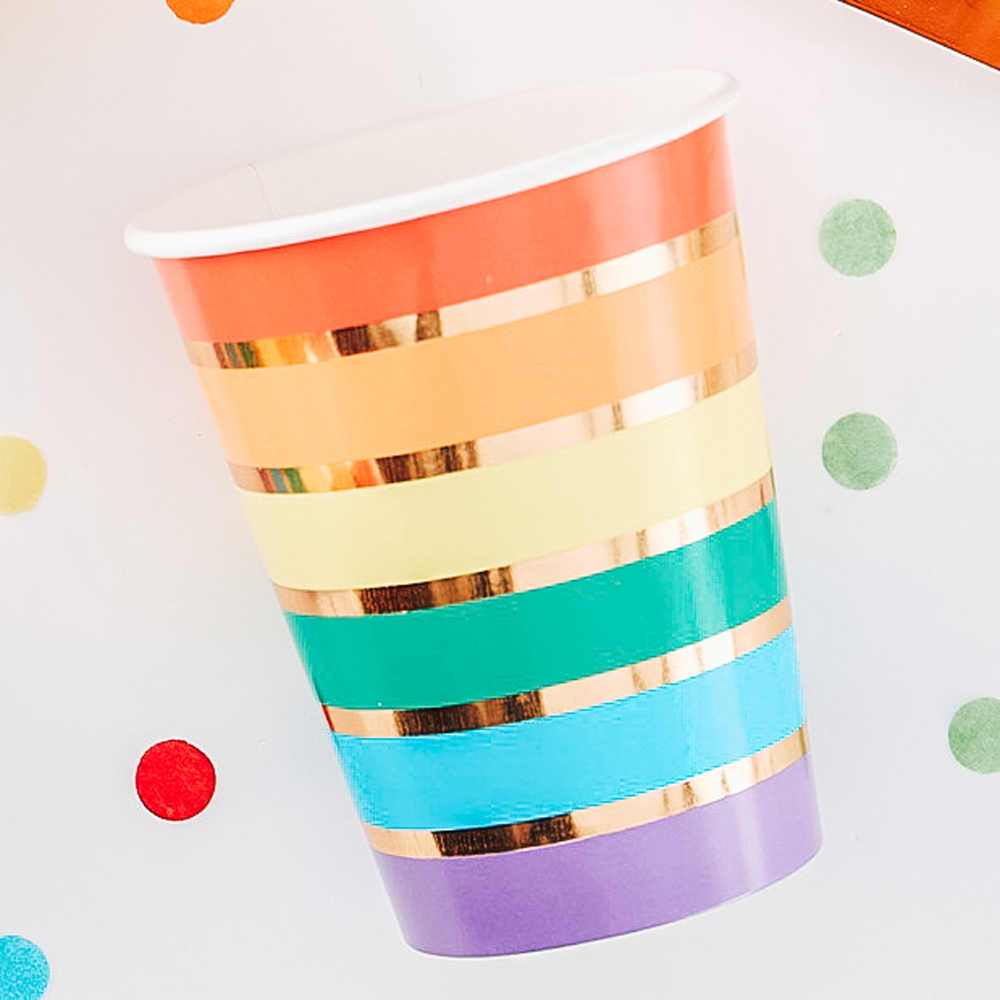 Questo set include 8 bicchieri di carta arcobaleno su base dorata.