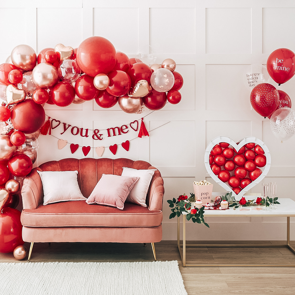 Ogni kit di decorazione con palloncini 5 palloncini con messaggi vari che includono “Happy Valentine’s Day”, “Be Mine” e “You & Me”.