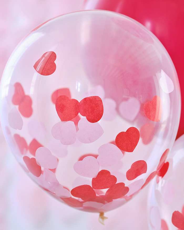Ogni confezione contiene 5 palloncini da 12″ circa, con la dedica ‘Happy Valentine’s Day’ e coriandoli a forma di cuore rosa e rossi da inserire nei palloncini trasparenti.