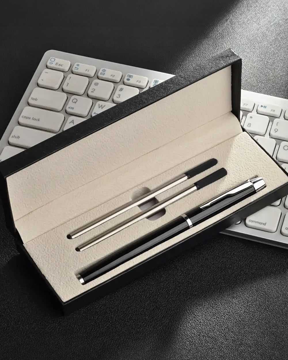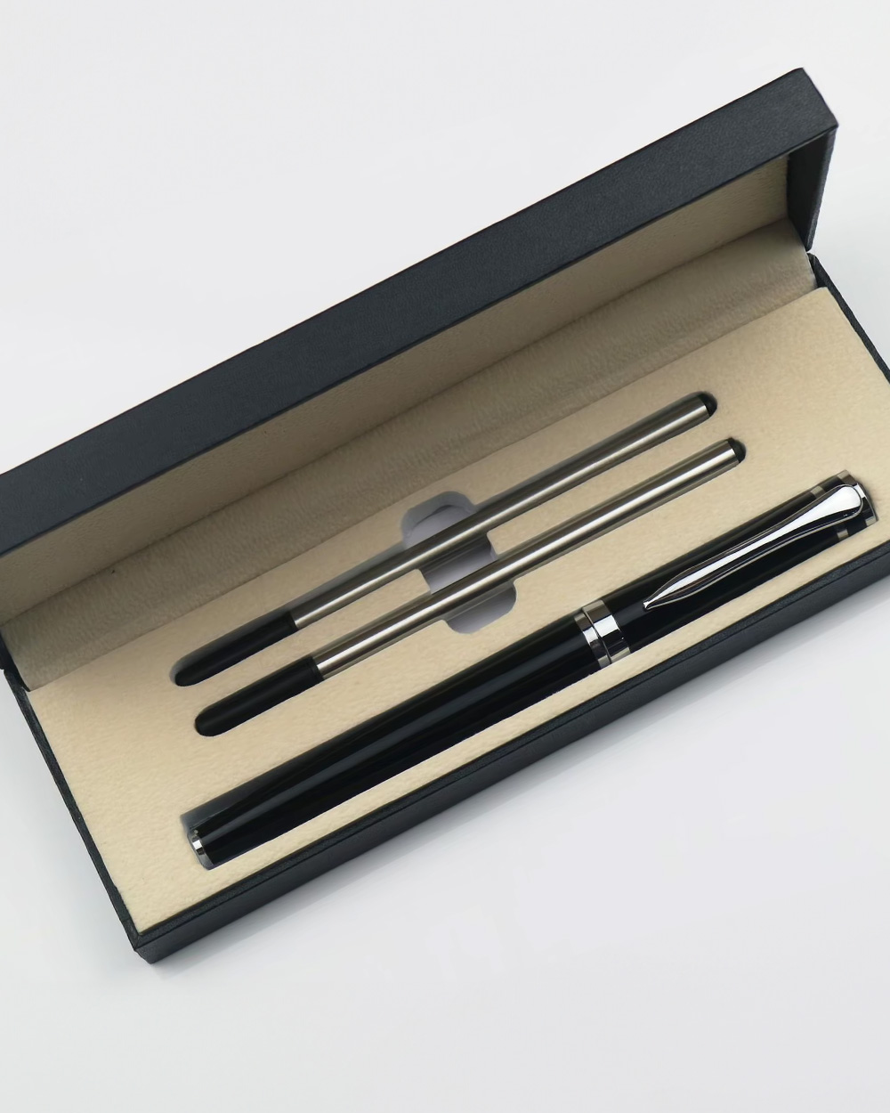 Questo raffinato set regalo comprende una penna elegante con finitura nera lucida e dettagli metallici, accompagnata da una confezione regalo in cofanetto imbottito. La penna è dotata di due ricariche extra per garantire un uso prolungato e un’esperienza di scrittura impeccabile.