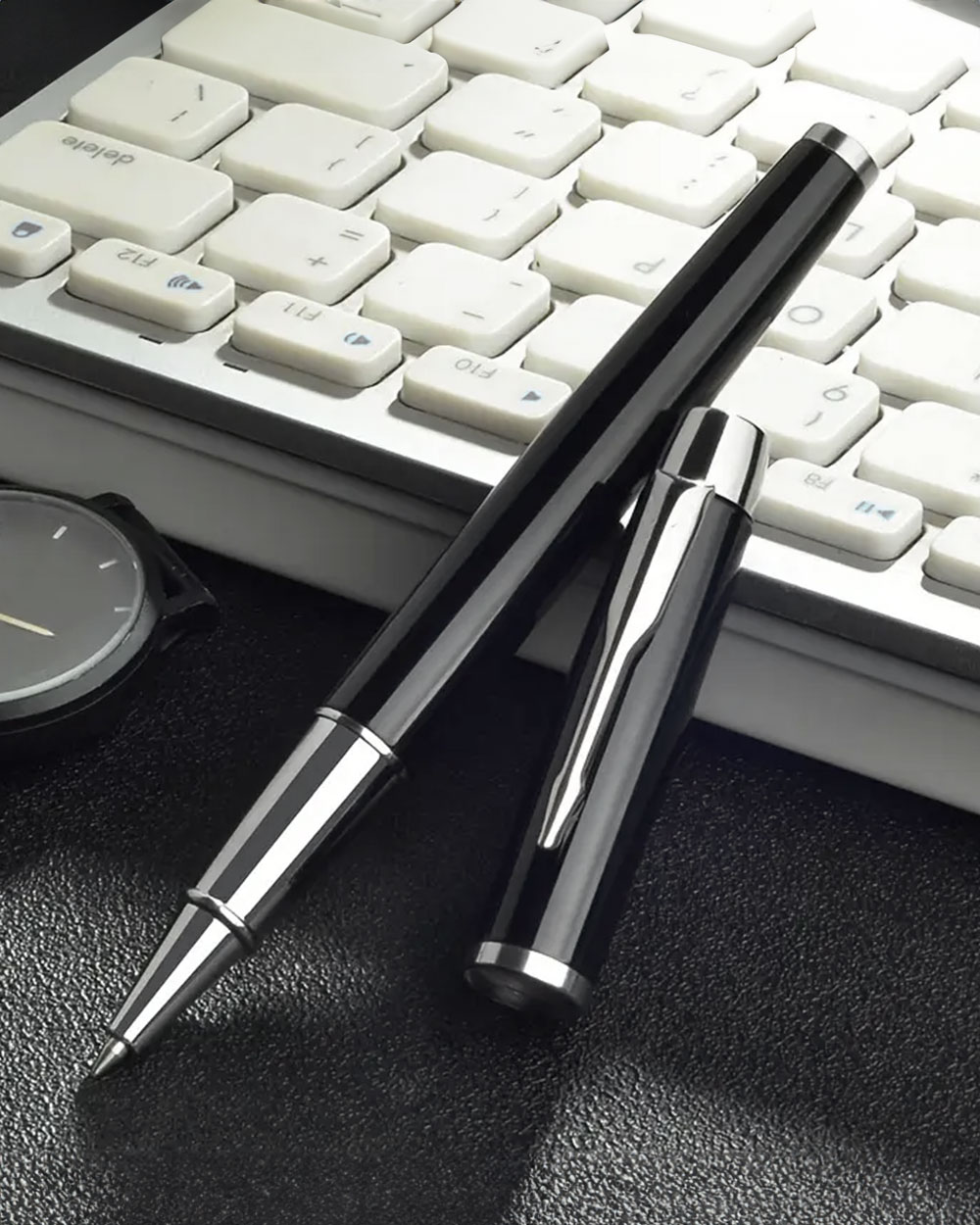 - Penna di alta qualità: Corpo nero lucido con dettagli in metallo cromato.