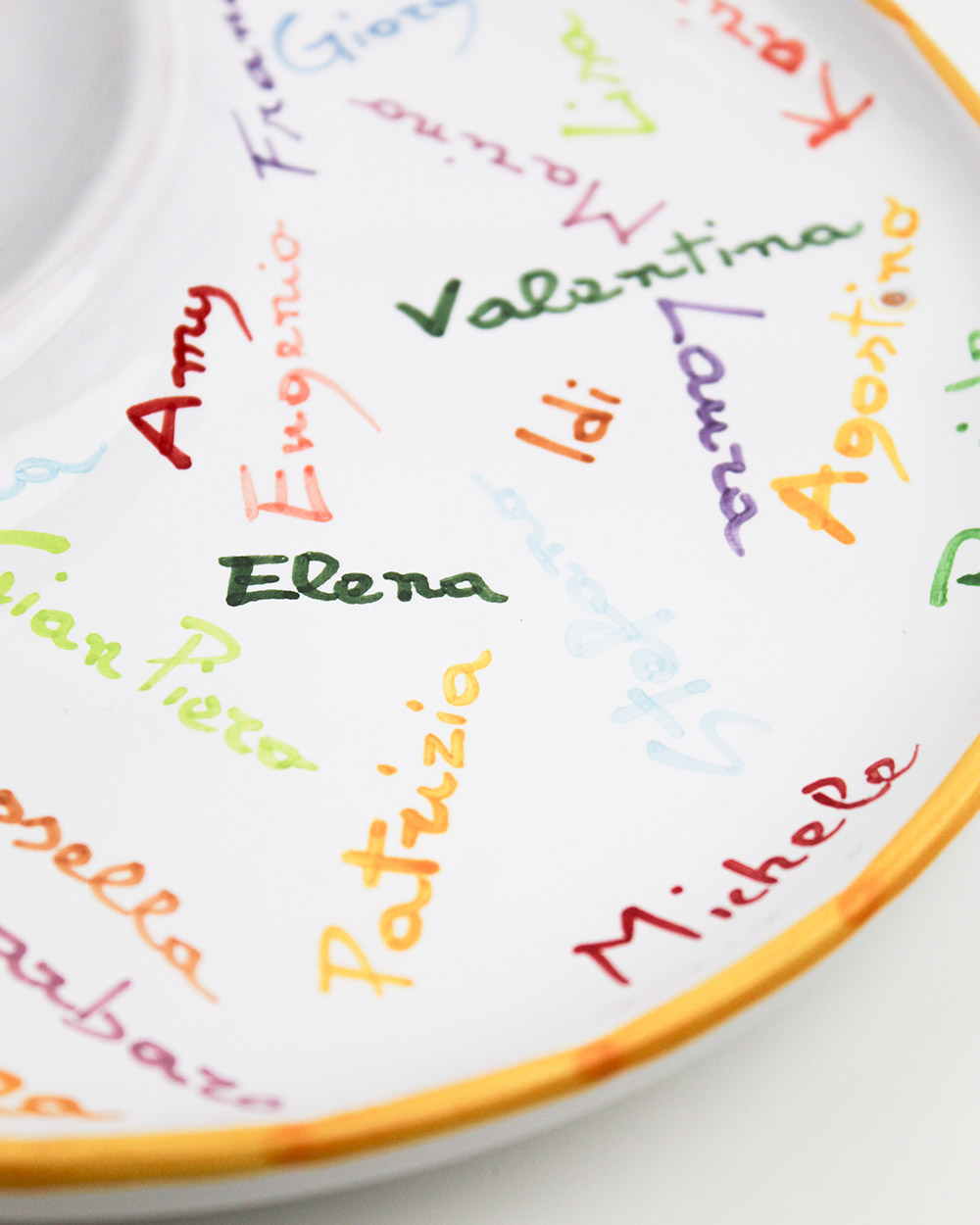 ATTENZIONE: Salvo diversa indicazione in nota, di norma i nomi vengono scritti tutti nella mezzaluna del piatto. A discrezione della ceramista, per ragioni di spazio, alcuni nomi verranno scritti anche nella parte tonda del piatto.