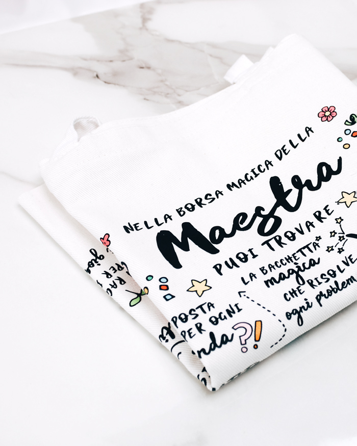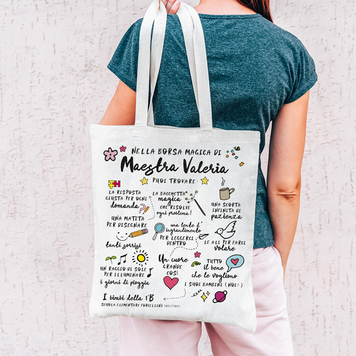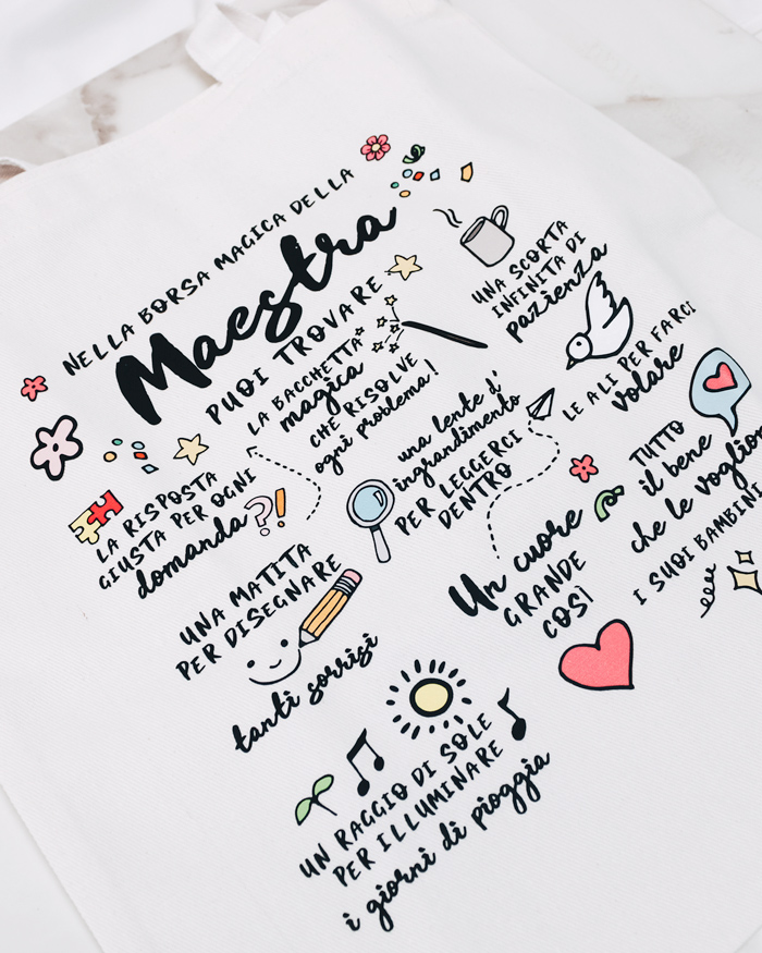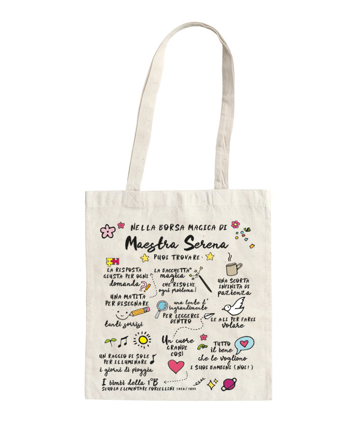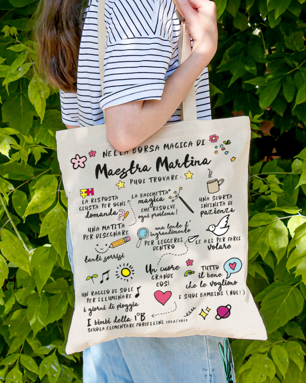 Le borse per le maestre sono spettacolari, materiale resistente, grafica bellissima, tutte le mamme ne sono entusiaste. La confezione regalo graziosa e ben fatta.