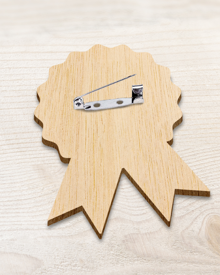 La spilla è realizzata in legno e misura 8×6 cm.