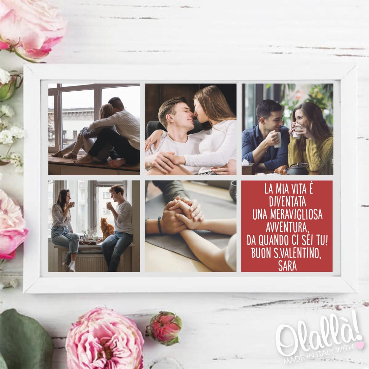 Stampa con foto collage dei vostri momenti più belli. Realizza un regalo personalizzato per San Valentino o per l’anniversario che sia davvero spettacolare! Il quadro viene impreziosito anche da una frase d’amore creata da te.