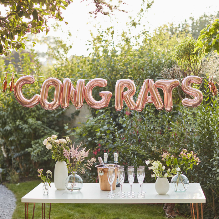 Con questo stupendo striscione con palloncini di congratulazioni in oro rosa sei pronto a festeggiare ogni occasione in grande stile. Questa splendida decorazione aggiungerà un sacco di lucentezza alla tua grande festa. Questo striscione a palloncino è ideale per tutta una serie di occasioni speciali, comprese feste di fidanzamento, anniversari e altro ancora!