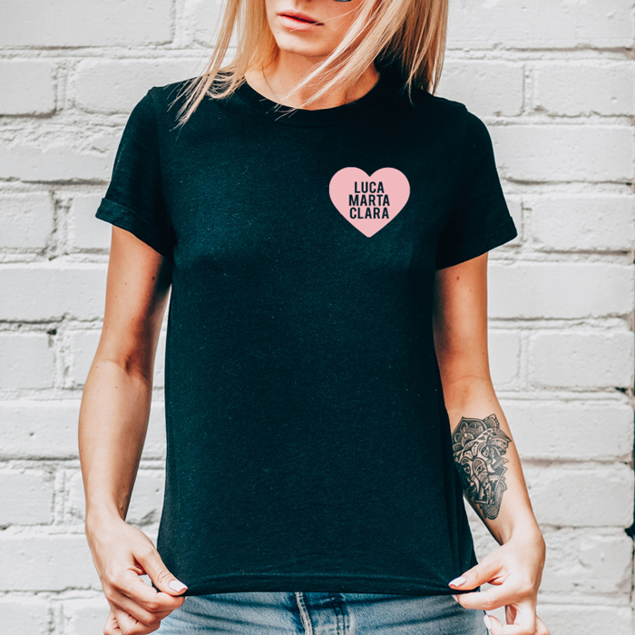 Bellissima T-Shirt Maglietta a maniche corte per la Mamma, personalizzata con il cuore e i nomi dei bambini. Stupisci la mamma del tuo cuore con questa t-shirt che lo farà sentire una mamma davvero speciale! È possibile personalizzare la t-shirt scegliendo il colore del cuoricino e i nomi da inserire al suo interno.