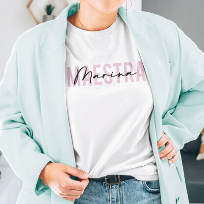 Regala questa splendida t-shirt personalizzata con la scritta “Maestra” e il suo nome all’insegnante dei tuoi bimbi, per ringraziarla per tutto quello che fa per i suoi studenti. Questa bellissima maglietta sarà un pensiero molto gradito e utile all’insegnante dei tuoi bimbi, per indossarla nelle lunghe giornate a scuola.