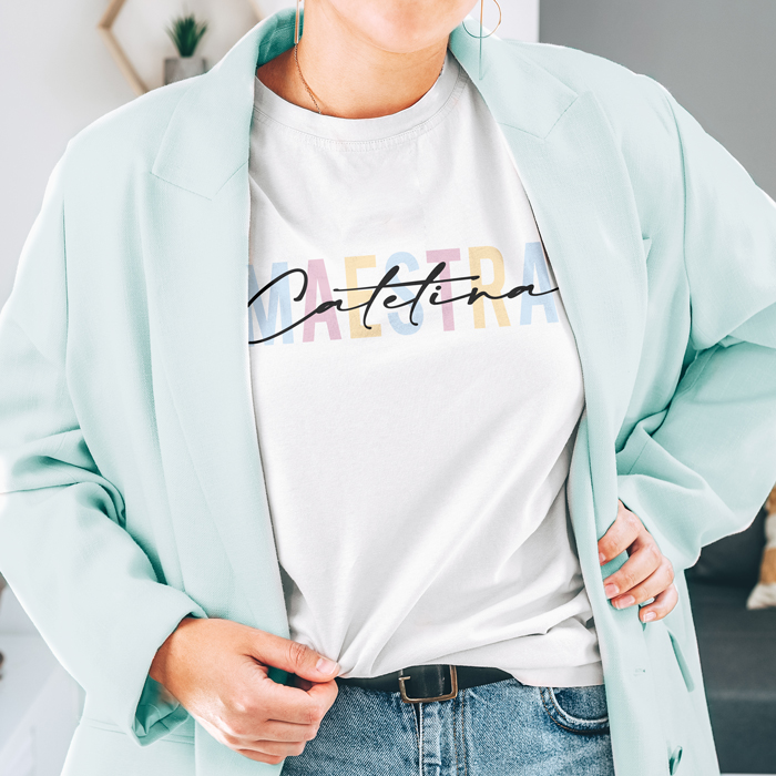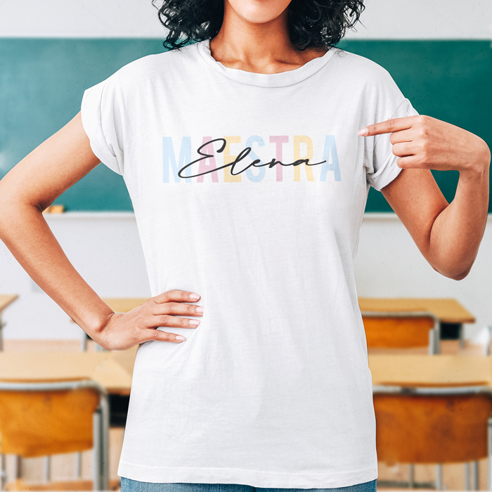 Regala questa splendida t-shirt personalizzata con la scritta “Maestra” e il suo nome all’insegnante dei tuoi bimbi, per ringraziarla per tutto quello che fa per i suoi studenti. Questa bellissima maglietta sarà un pensiero molto gradito e utile all’insegnante dei tuoi bimbi, per indossarla nelle lunghe giornate a scuola.