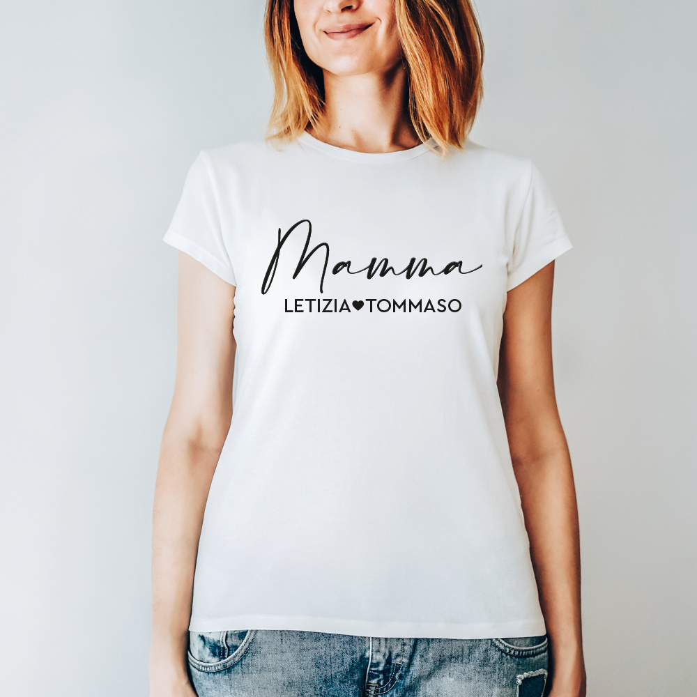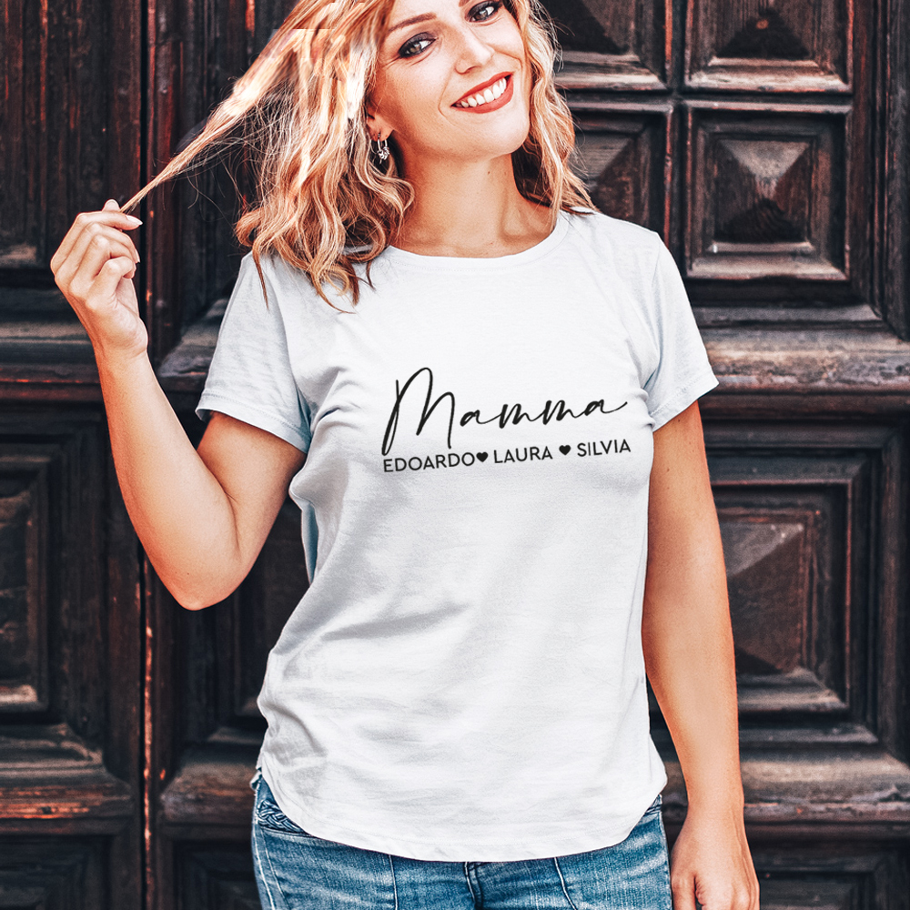Magnifica T-Shirt per la mamma in stile moderno con la scritta “Mamma”. Una bellissima t-shirt personalizzabile con i nomi dei tuoi bambini: sarà un ricordo perfetto per ogni mamma. Questa maglietta è un fantastico regalo per la festa della Mamma dell’8 Maggio, per una madre felice ed orgogliosa, oppure per il suo compleanno.