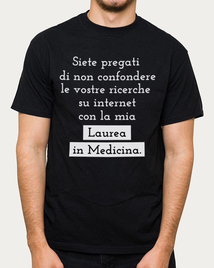 Spiritosa T-Shirt con scritta “Siete pregati di non confondere le vostre ricerche in Internet con la mia laurea in Medicina”, perfetta per ricordare scherzosamente che nessuna ricerca in Internet vale tanto quanto una laurea in medicina! Una chicca ironica che non mancherà di rallegrare il dottore neo laureato e ricordargli quanto importante sia il traguardo raggiunto.