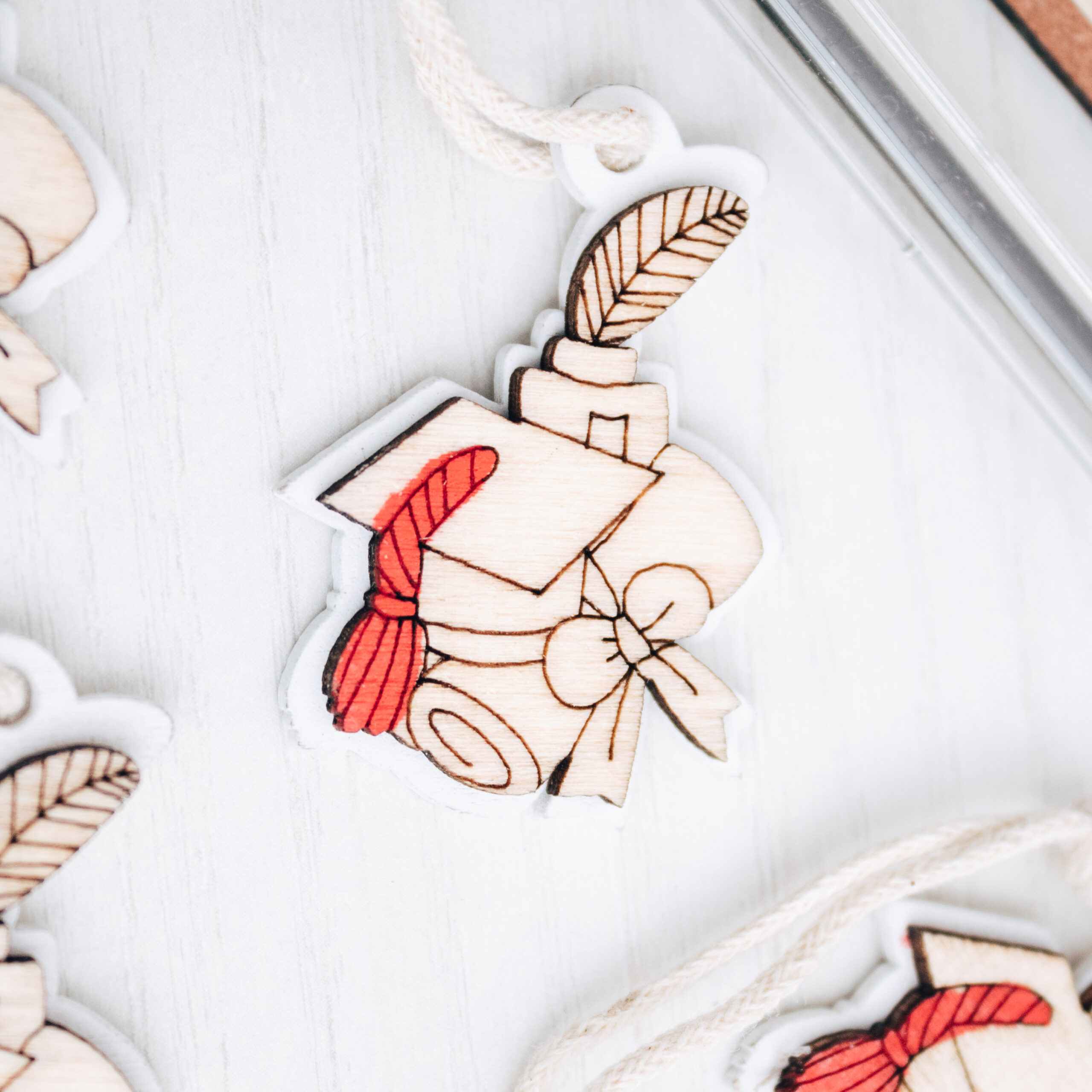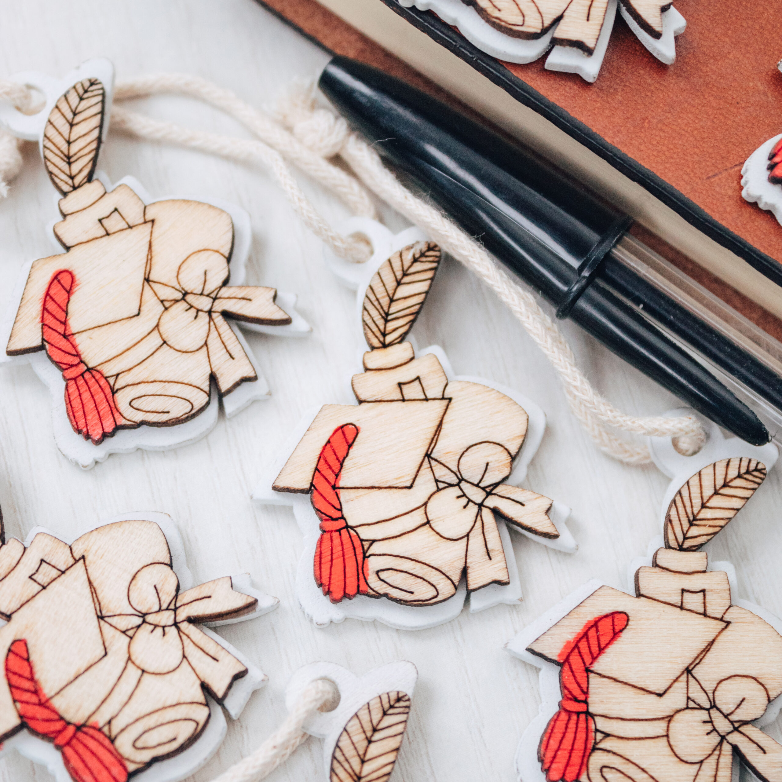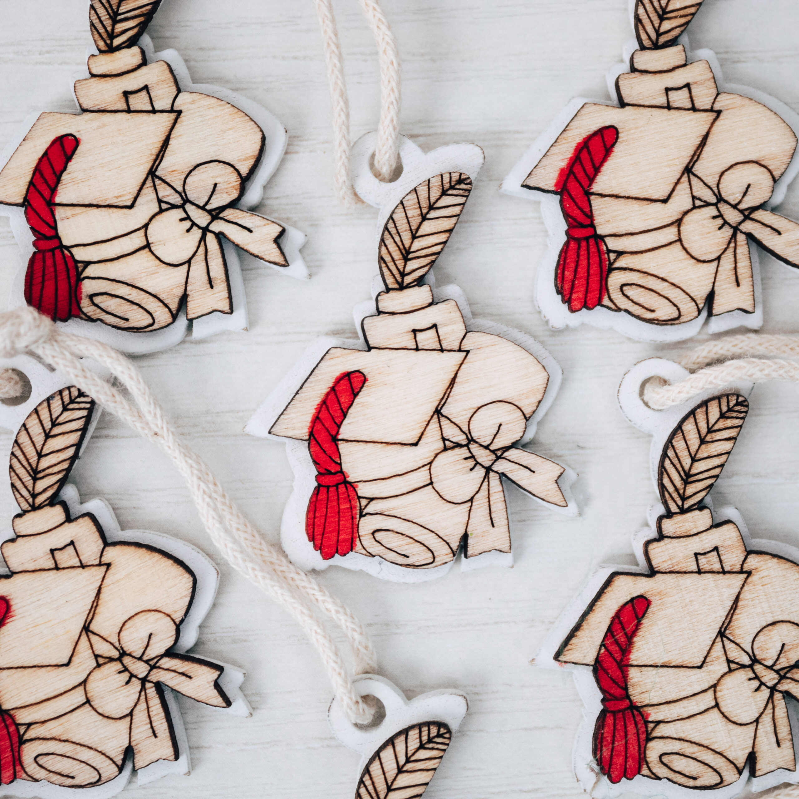 Bellissimo set di 10 tag in legno a forma di cappello di laurea. Perfetti per essere usati come decorazione finale per la tavola della tua cerimonia oppure per completare le bomboniere della tua Laurea.