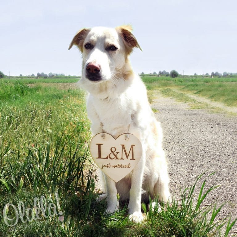 Targhetta per cane o gatto in legno a forma di cuore con incisione personalizzata.