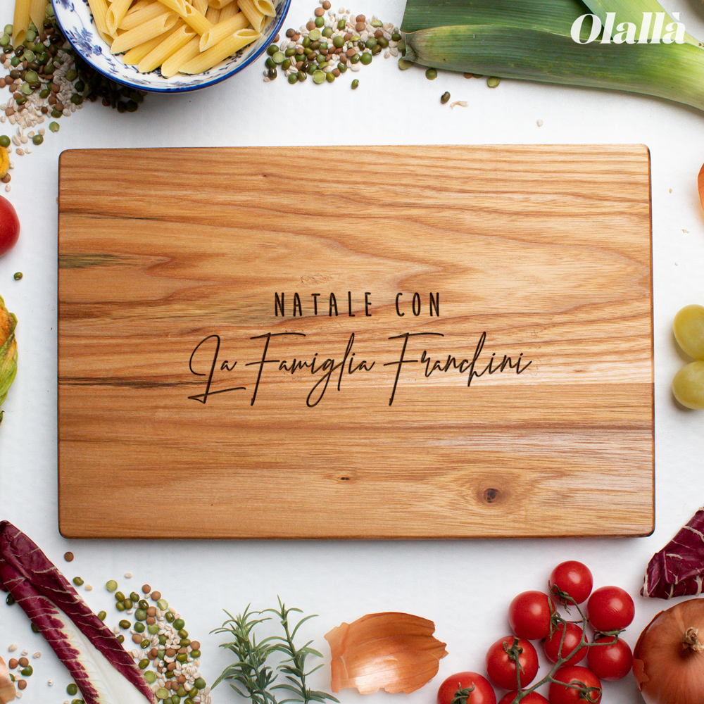 Tagliere personalizzato con la frase incisa “Natale con” e il nome della vostra famiglia del cuore. Il regalo ideale per i vostri genitori o per vostri cari nonni, che saranno davvero estasiati di trovare sotto l’albero un lavoro di altissimo artigianato e personalizzato esclusivamente per loro! Il tagliere è disponibile in varie dimensioni e tipi di legno.
