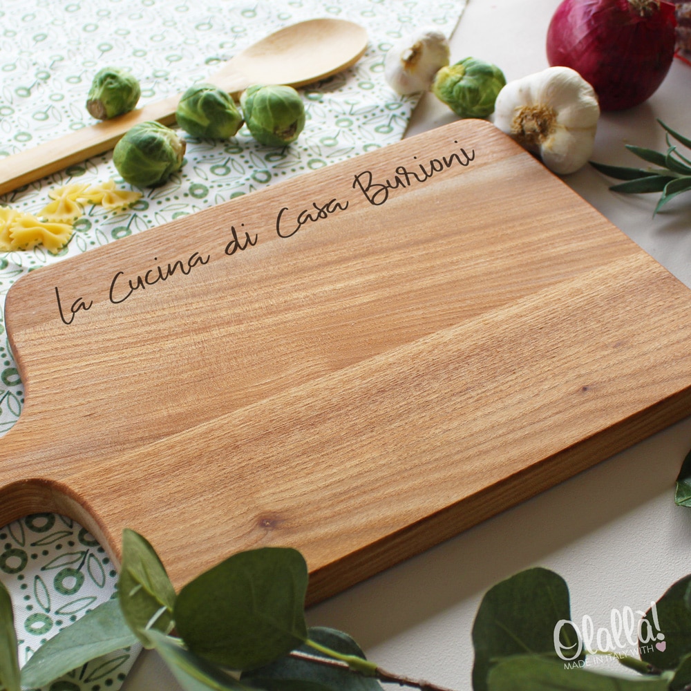 Tagliere in legno personalizzato che reca la frase “La Cucina di Casa..”. Scrivi il nome o cognome dei fortunati a cui vuoi regalare questo bellissimo tagliere! Idea regalo unica ed originale per chi ama dilettarsi ai fornelli! Il tagliere è disponibile in varie dimensioni e tipi di legno.