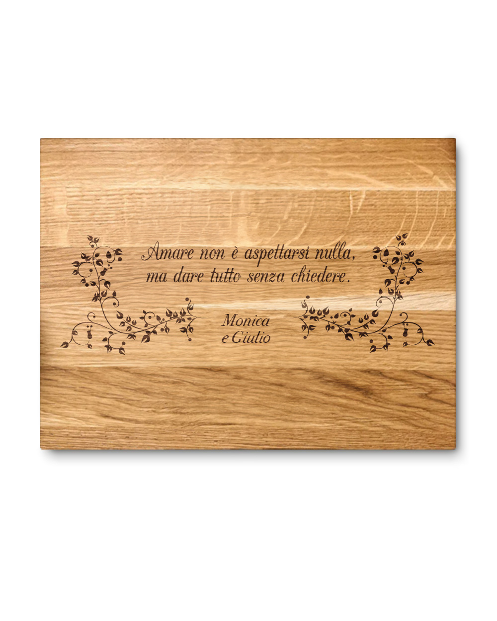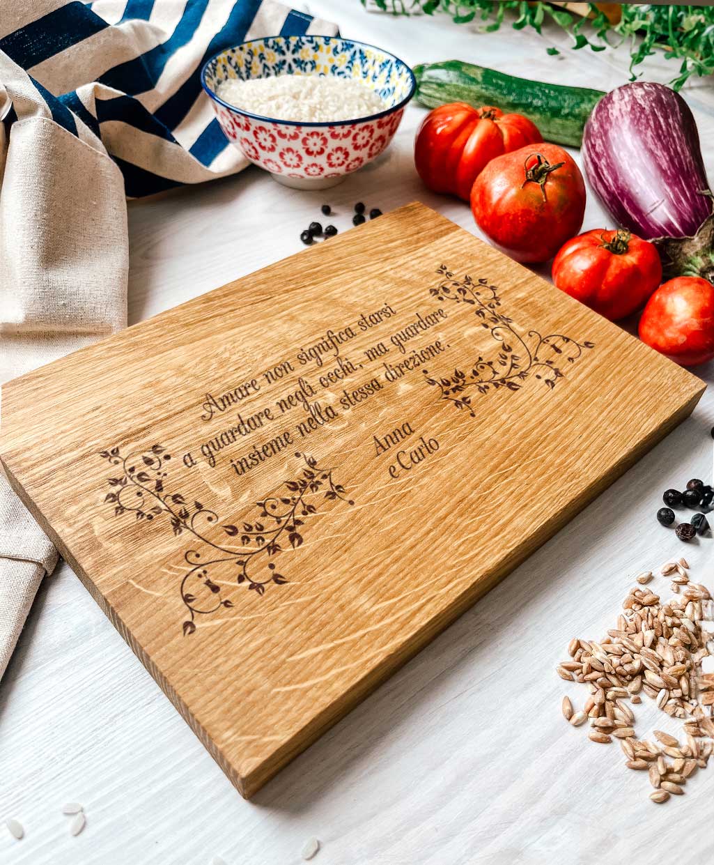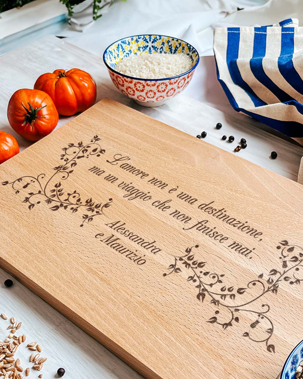Tagliere personalizzato con il decoro di rametti di foglie, la dedica che desideri e i nomi della coppia. Una bellissima idea regalo per l’anniversario, per San Valentino o per il matrimonio. Il tagliere è disponibile in varie dimensioni e tipi di legno. Ideale per servire ottimi antipasti, portare in tavola le vostre pietanze o anche come decorazione originale ed unica per la cucina.