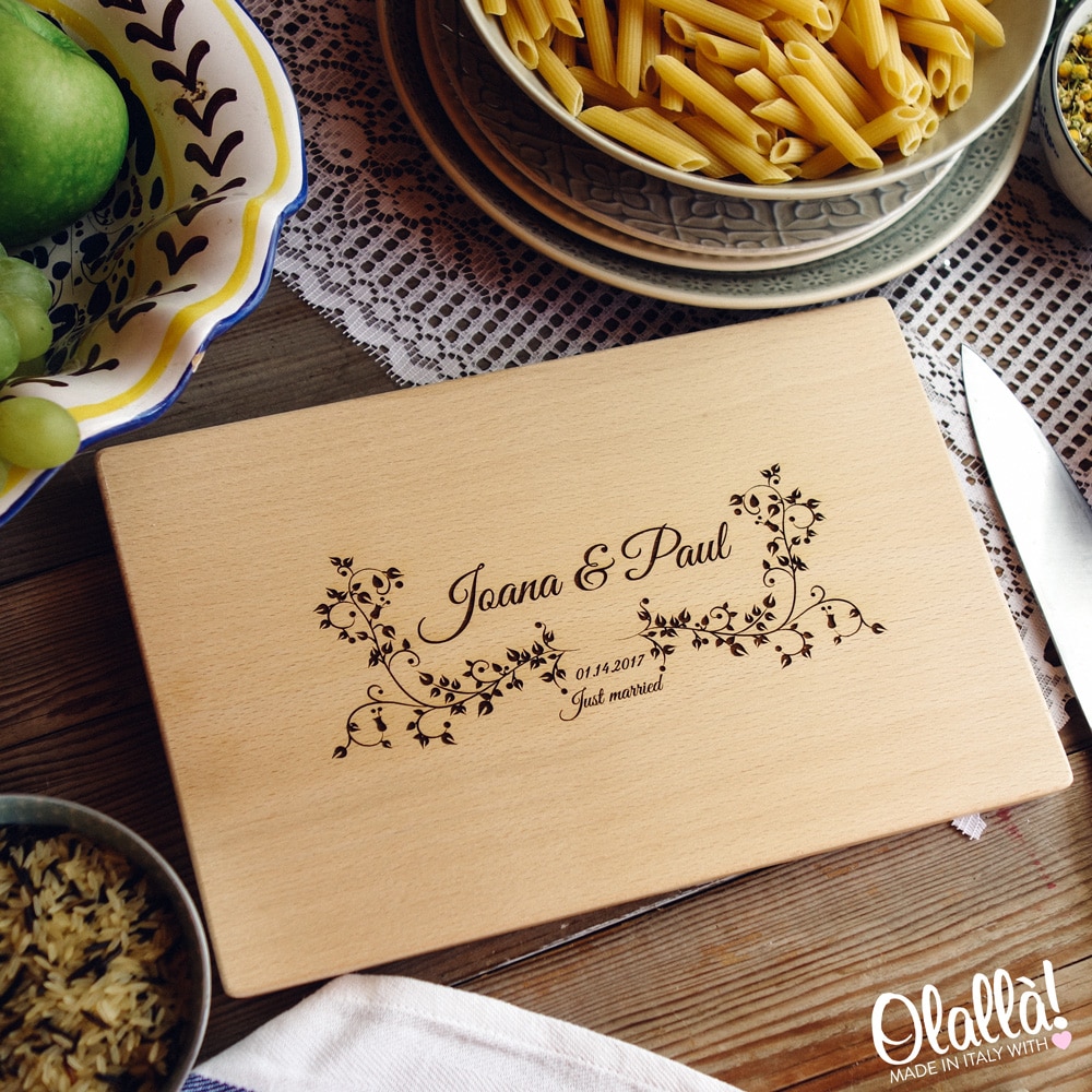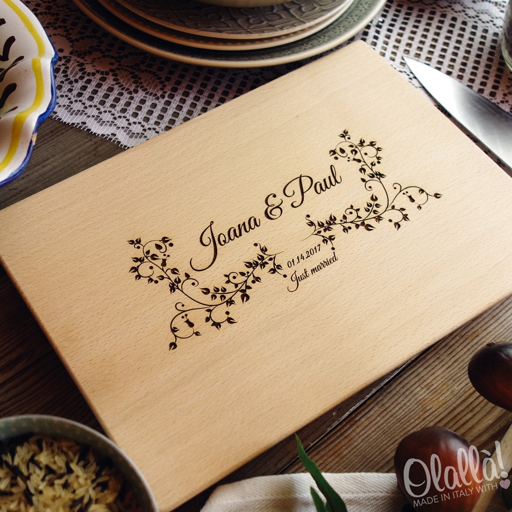 Tagliere personalizzato con un decoro di rametti e foglie e incisi i vostri nomi, la data del vostro grande giorno con la scritta “Just married!” Una bellissima idea regalo per una coppia di amici novelli sposi! Il tagliere è disponibile in varie dimensioni e tipi di legno.