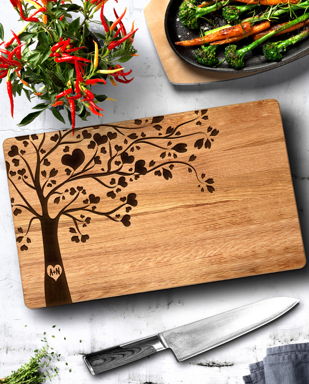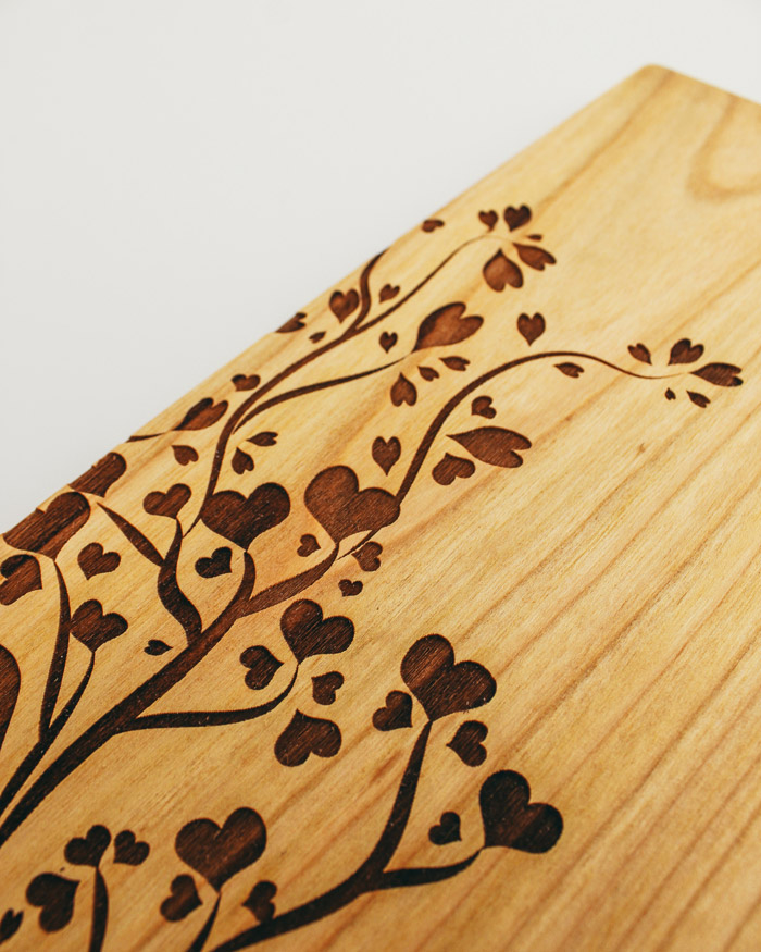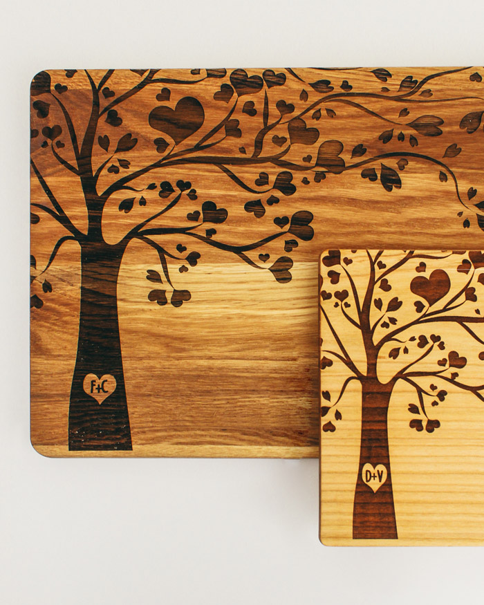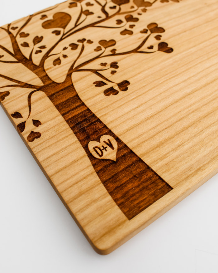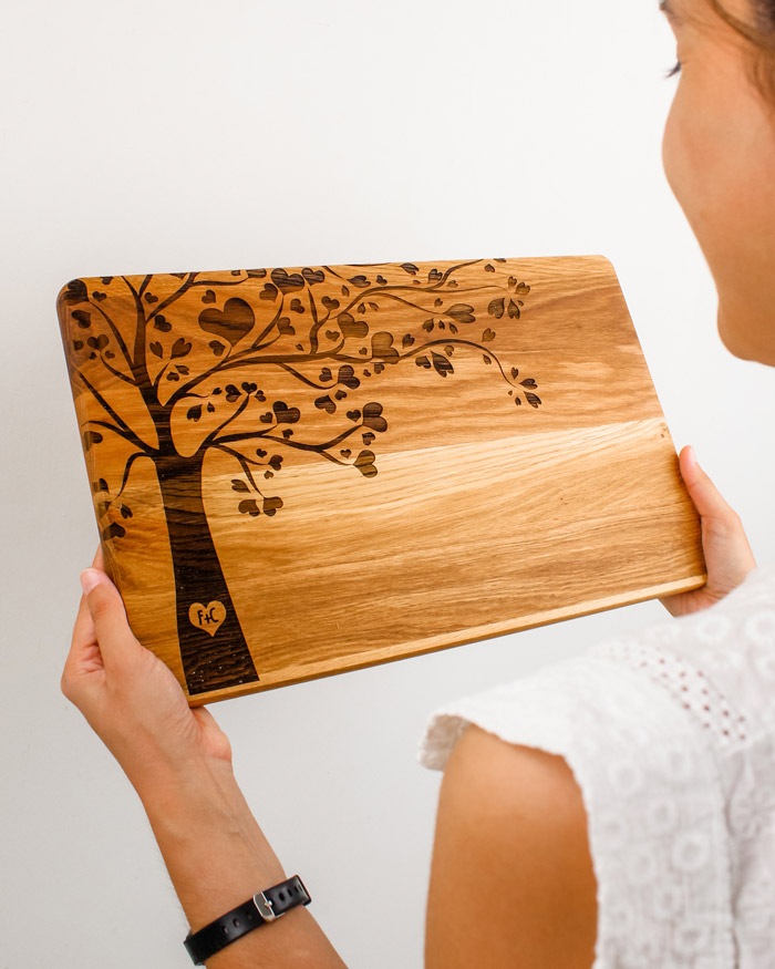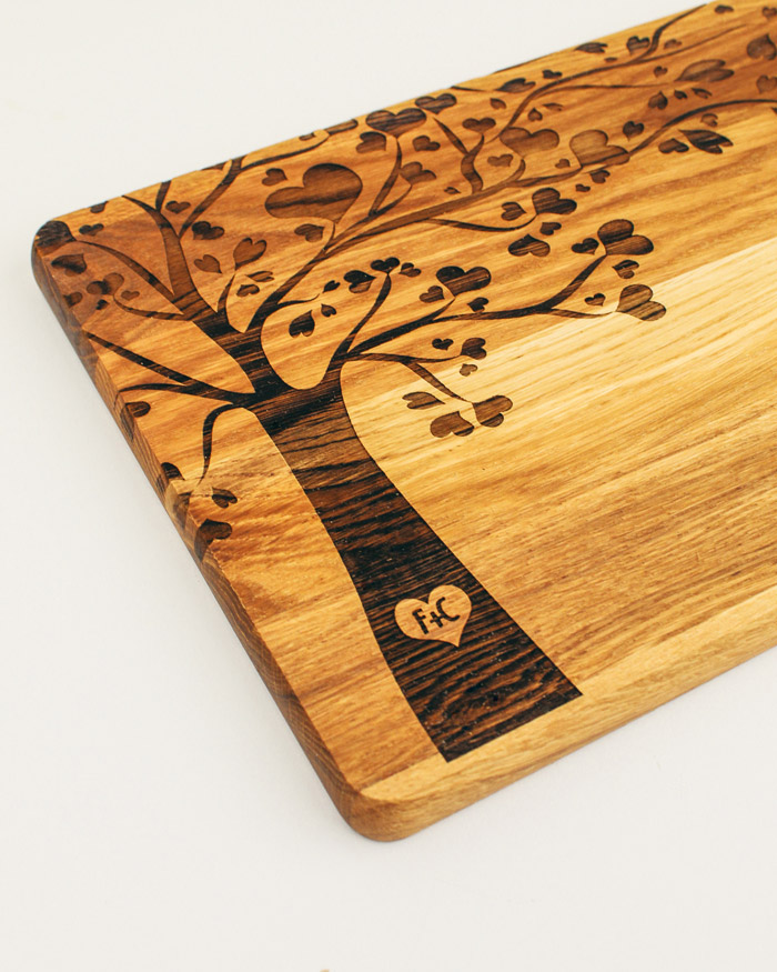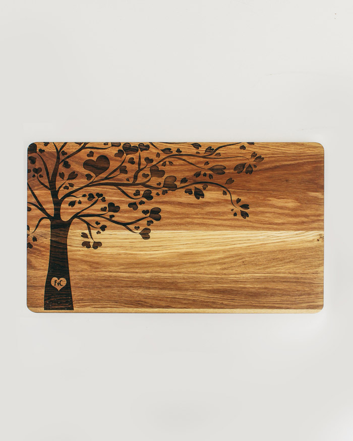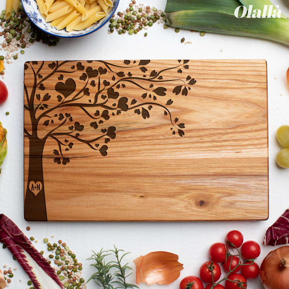 Tagliere di legno personalizzato con le vostre iniziali incise sul tronco di un romantico albero che simboleggia l’amore e la vita. Regalo perfetto per festeggiare un momento importante, come il matrimonio, San Valentino, Natale o l’anniversario soprattutto se il regalo è pensato per amanti della buona cucina! Il tagliere è disponibile in varie dimensioni, tra legno di ciliegio e pregiatissimo rovere.  Un regalo bello, significativo e di valore. Indicato per servire ottimi manicaretti, portare in tavola le vostre pietanze o anche come decorazione originale ed unica per la cucina.