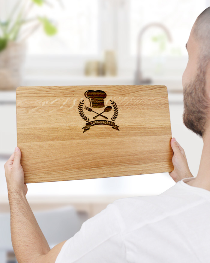 Simpatico tagliere di legno personalizzato con cappello da chef e posate. Un regalo divertente per il tuo amico o amica appassionata di cucina! Il tagliere è disponibile in varie dimensioni, tra legno di ciliegio e pregiatissimo rovere. Ideale per servire ottimi antipasti, portare in tavola le vostre pietanze o anche come decorazione originale ed unica per la cucina.