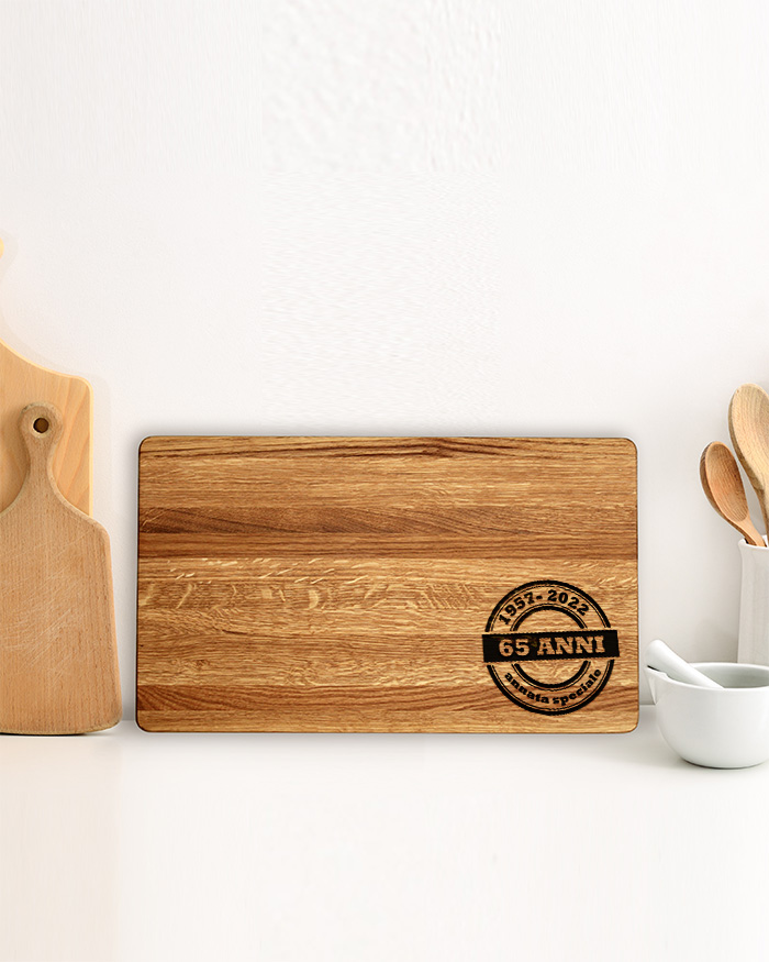 Simpatico Tagliere di legno personalizzato con un’incisione con gli anni e l’età del festeggiato. Un regalo perfetto per il compleanno della tua amica o amico appassionato di cucina! Il tagliere è disponibile in varie dimensioni, tra legno di ciliegio e pregiatissimo rovere. Ideale per servire ottimi antipasti, portare in tavola le vostre pietanze o anche come decorazione originale ed unica per la cucina.