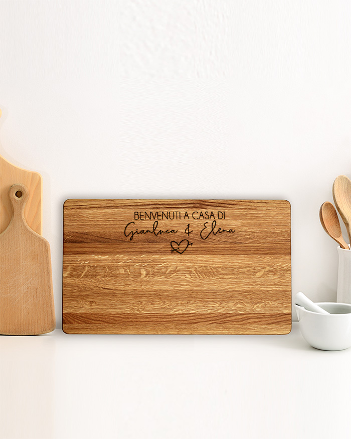 Elegante e raffinato Tagliere di legno personalizzato con un’incisione con i vostri nomi. Un regalo perfetto per festeggiare l’arrivo in una nuova casa! Il tagliere è disponibile in varie dimensioni, tra legno di ciliegio e pregiatissimo rovere. Ideale per servire ottimi antipasti, portare in tavola le vostre pietanze o anche come decorazione originale ed unica per la cucina.