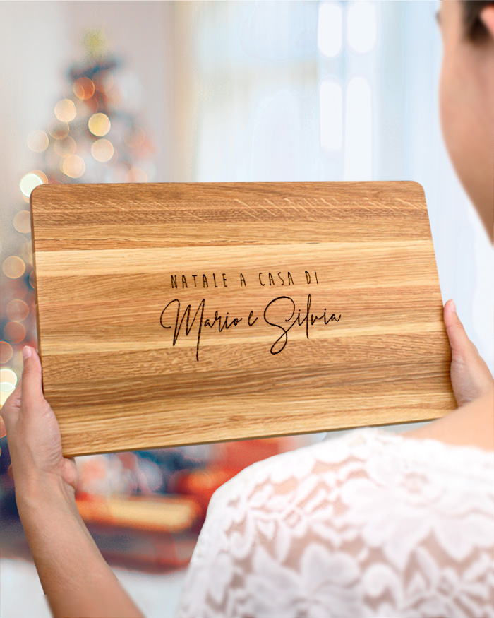 Tagliere di legno personalizzato con l’incisione che desideri. Un regalo di natale perfetto per una coppia di amici! Il tagliere è disponibile in varie dimensioni, tra legno di ciliegio e pregiatissimo rovere. Ideale per servire ottimi antipasti, portare in tavola le vostre pietanze o anche come decorazione originale ed unica per la cucina.