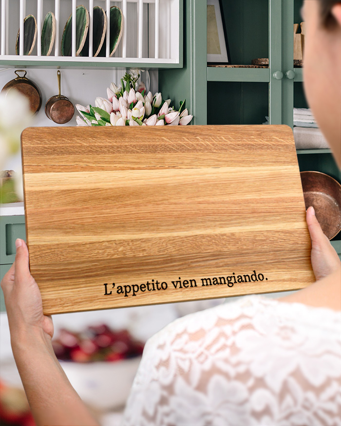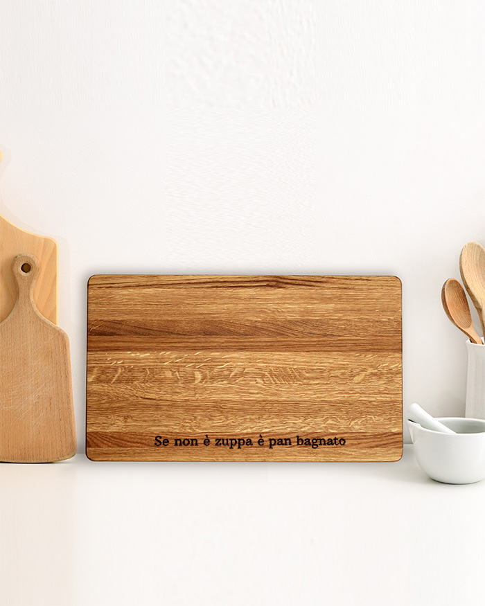 Simpatico Tagliere di legno personalizzato con una frase divertente o motivazionale. Un dolce pensiero per la donna o l’uomo appassionato di cucina! Il tagliere è disponibile in varie dimensioni, tra legno di ciliegio e pregiatissimo rovere. Ideale per servire ottimi antipasti, portare in tavola le vostre pietanze o anche come decorazione originale ed unica per la cucina.