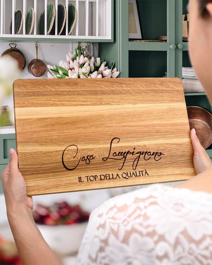 Elegante Tagliere di legno personalizzato con un’incisione contenente il nome e la dedica che preferisci. Un regalo perfetto per il compleanno della tua amica o amico appassionato di cucina! Il tagliere è disponibile in varie dimensioni, tra legno di ciliegio e pregiatissimo rovere. Ideale per servire ottimi antipasti, portare in tavola le vostre pietanze o anche come decorazione originale ed unica per la cucina.