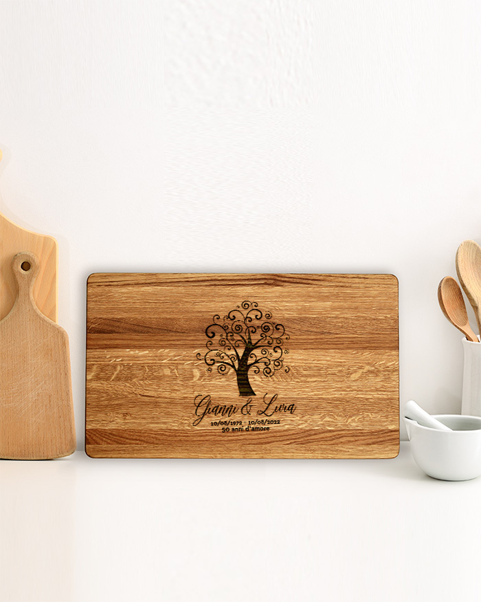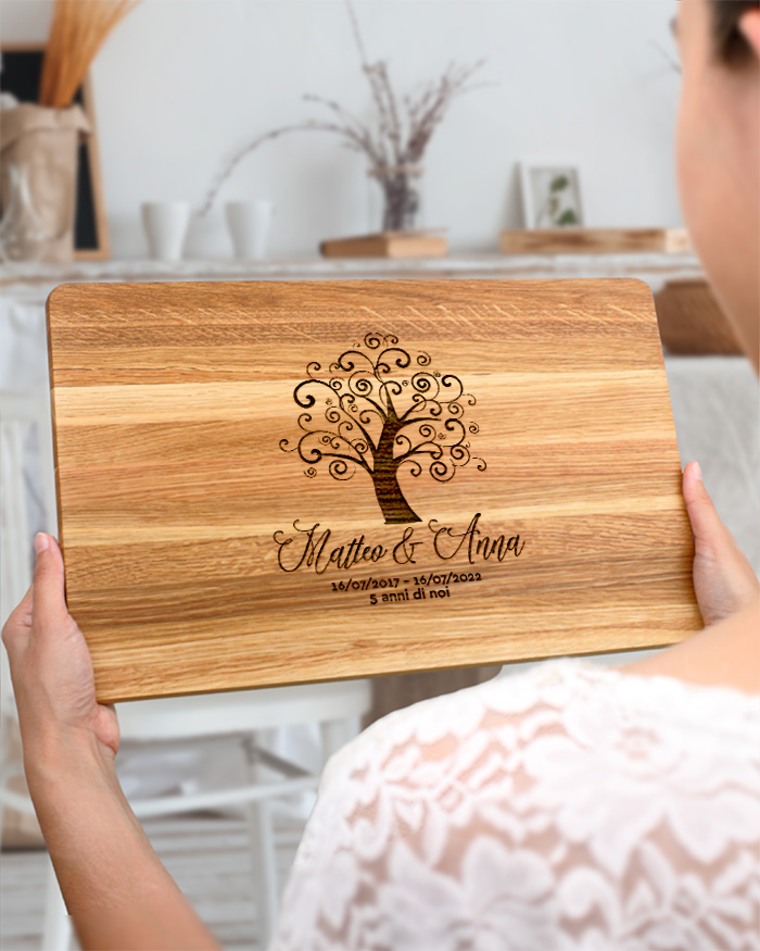 Romantico Tagliere di legno personalizzato con un’incisione con i vostri nomi e l’albero della vita, a simboleggiare il vostro amore. Un regalo perfetto per festeggiare un momento importante, come il matrimonio, San Valentino, Natale o il vostro anniversario! Il tagliere è disponibile in varie dimensioni, tra legno di ciliegio e pregiatissimo rovere. Ideale per servire ottimi antipasti, portare in tavola le vostre pietanze o anche come decorazione originale ed unica per la cucina.