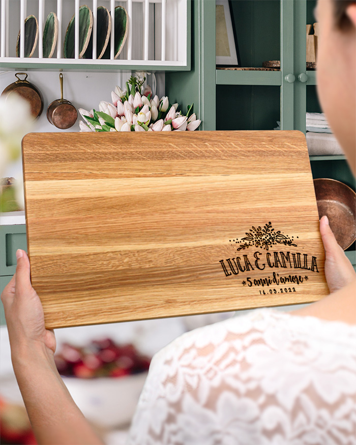 Tagliere di legno personalizzato con un’incisione con i nomi che desideri accompagnati da una decorazione floreale. Un regalo perfetto per festeggiare un momento importante, come il vostro anniversario! Il tagliere è disponibile in varie dimensioni, tra legno di ciliegio e pregiatissimo rovere. Ideale per servire ottimi antipasti, portare in tavola le vostre pietanze o anche come decorazione originale ed unica per la cucina.
