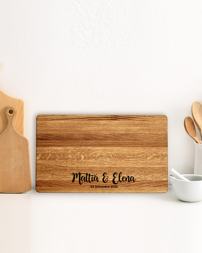 Dolce Tagliere di legno personalizzato con i vostri nomi e una breve dedica finale. Un regalo perfetto per festeggiare un momento importante, come il matrimonio, San Valentino, Natale o il vostro anniversario! Il tagliere è disponibile in varie dimensioni, tra legno di ciliegio e pregiatissimo rovere. Ideale per servire ottimi antipasti, portare in tavola le vostre pietanze o anche come decorazione originale ed unica per la cucina.