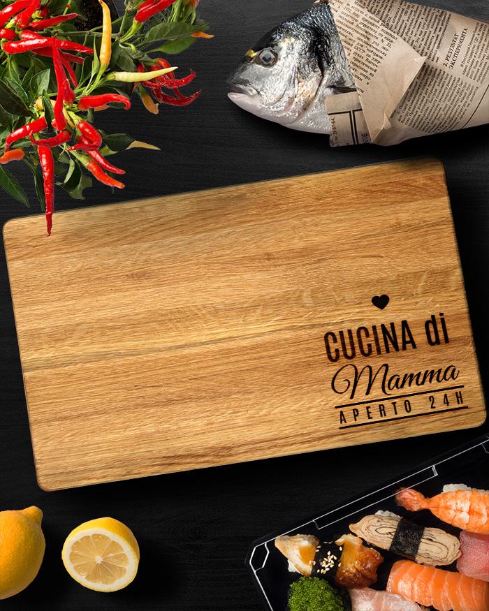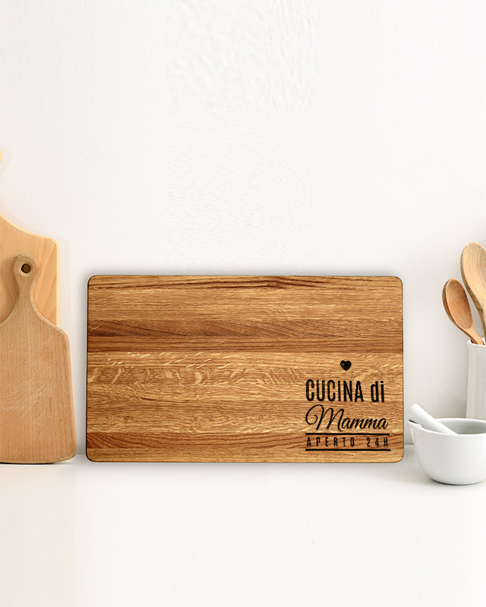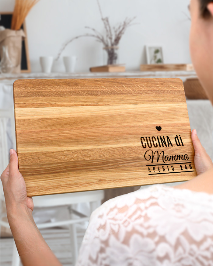Dolce ed Elegante Tagliere di legno personalizzato con una dedica incisa per la mamma. Un dolce pensiero che renderà sicuramente felice la mamma amante della cucina! Il tagliere è disponibile in varie dimensioni, tra legno di ciliegio e pregiatissimo rovere. Ideale per servire ottimi antipasti, portare in tavola le vostre pietanze o anche come decorazione originale ed unica per la cucina.