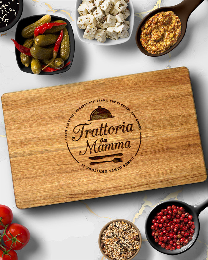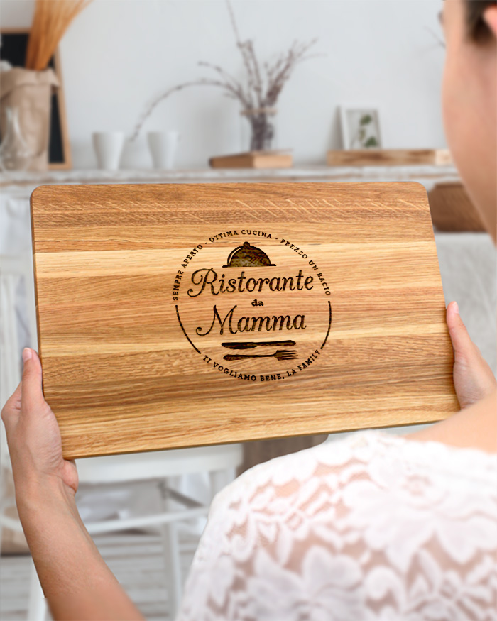 Simpatico Tagliere di legno personalizzato con una dedica incisa per la mamma. Un dolce pensiero che renderà sicuramente felice la mamma amante della cucina! Il tagliere è disponibile in varie dimensioni, tra legno di ciliegio e pregiatissimo rovere. Ideale per servire ottimi antipasti, portare in tavola le vostre pietanze o anche come decorazione originale ed unica per la cucina.