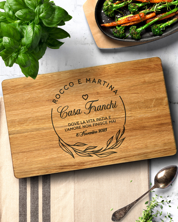 Stupendo tagliere di legno personalizzato con incisione dei nomi e la frase “Dove la Vita ha inizio e l’Amore non finisce mai”. Un regalo perfetto per la vostra famiglia o da regalare agli amici che festeggiano l’acquisto di una nuova casa o la nascita di un bimbo! Ideale per servire ottimi antipasti, portare in tavola le vostre pietanze o anche come decorazione originale ed unica per la cucina.