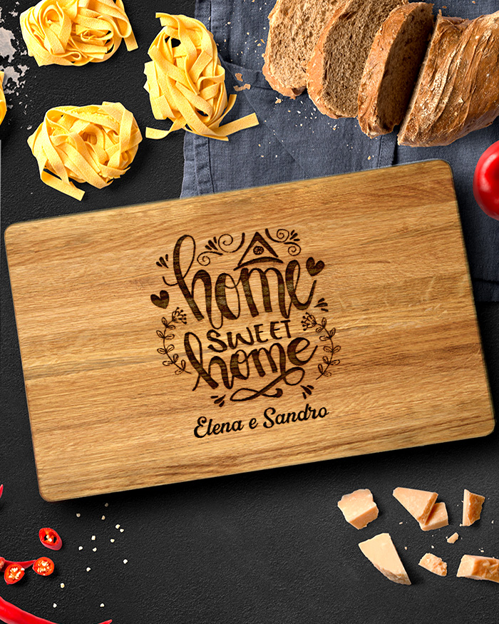 Magnifico Tagliere di legno personalizzato con l’incisione “Home Sweet Home” e la dedica che desideri. Un regalo perfetto per festeggiare l’arrivo in una nuova casa! Il tagliere è disponibile in varie dimensioni, tra legno di ciliegio e pregiatissimo rovere. Ideale per servire ottimi antipasti, portare in tavola le vostre pietanze o anche come decorazione originale ed unica per la cucina. La frase “Home Sweet home” resta fissa.