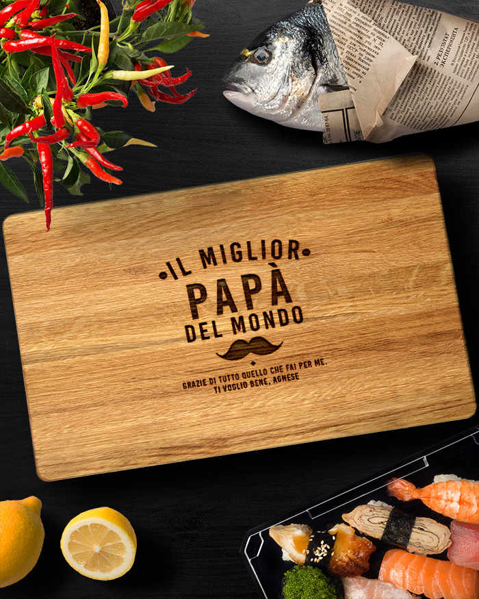 Stupendo Tagliere di legno personalizzato con un’incisione per il papà migliore del mondo. Un dolce pensiero per festeggiare la festa del papà oppure il compleanno! Il tagliere è disponibile in varie dimensioni, tra legno di ciliegio e pregiatissimo rovere. Ideale per servire ottimi antipasti, portare in tavola le vostre pietanze o anche come decorazione originale ed unica per la cucina.