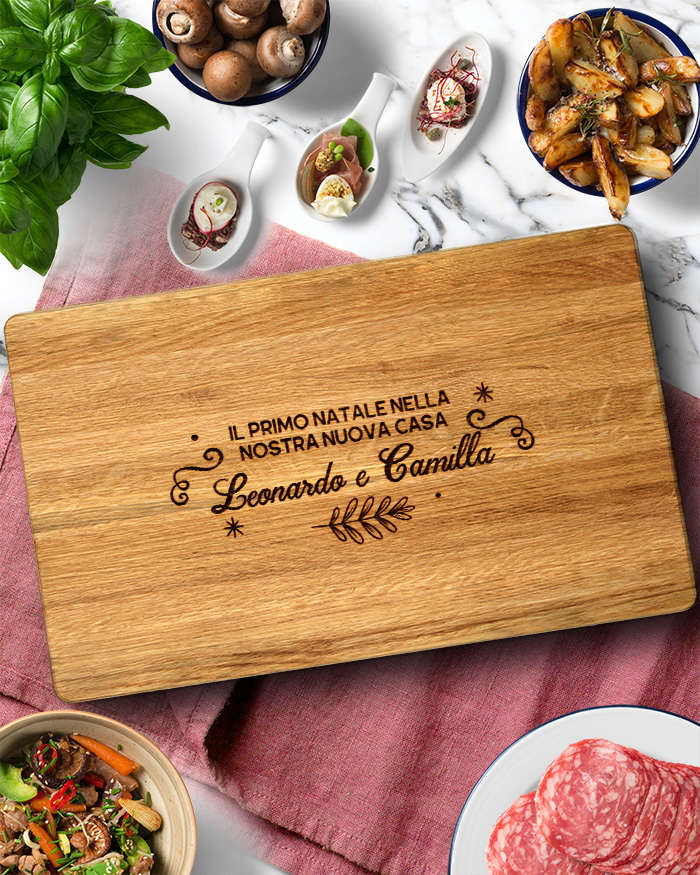 Stupendo Tagliere di legno personalizzato con la frase che desideri. Un piccolo pensiero da donare il giorno di natale alla coppia di vicini di casa oppure di amici che si è appena trasferita! Il tagliere è disponibile in varie dimensioni, tra legno di ciliegio e pregiatissimo rovere. Ideale per servire ottimi antipasti, portare in tavola le vostre pietanze o anche come decorazione originale ed unica per la cucina.