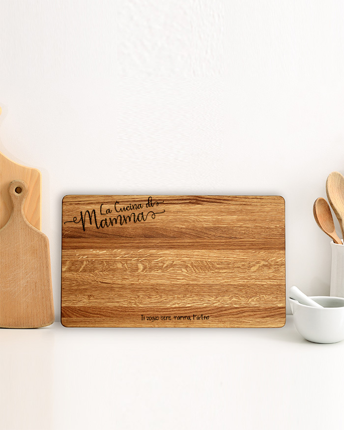 Elegante Tagliere di legno personalizzato con la frase che desideri in corsivo e una dedica. Un dolce pensiero per la mamma appassionata di cucina! Il tagliere è disponibile in varie dimensioni, tra legno di ciliegio e pregiatissimo rovere. Ideale per servire ottimi antipasti, portare in tavola le vostre pietanze o anche come decorazione originale ed unica per la cucina.