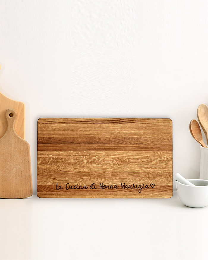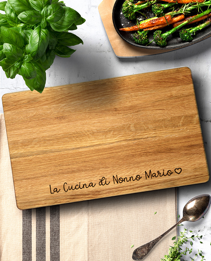 Stupendo Tagliere di legno personalizzato con una dedica incisa per la tua nonna amante della cucina. Un regalo perfetto per festeggiare la festa dei nonni con un pensiero unico! Il tagliere è disponibile in varie dimensioni, tra legno di ciliegio e pregiatissimo rovere. Ideale per servire ottimi antipasti, portare in tavola le vostre pietanze o anche come decorazione originale ed unica per la cucina.
