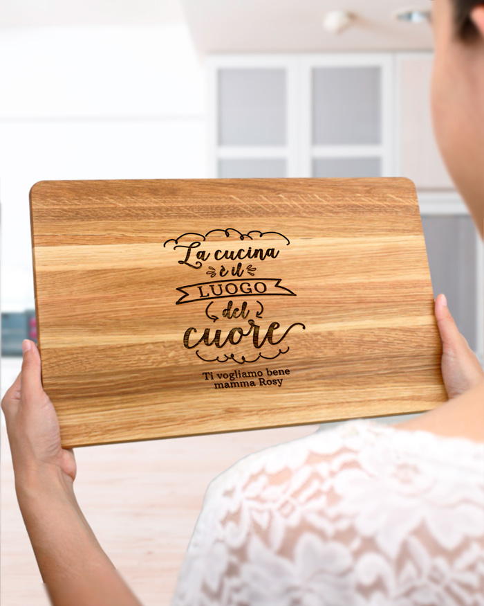 Meraviglioso Tagliere di legno personalizzato con una dedica incisa. Un dolce pensiero che renderà sicuramente felice la mamma o chiunque lo riceverà! Il tagliere è disponibile in varie dimensioni, tra legno di ciliegio e pregiatissimo rovere. Ideale per servire ottimi antipasti, portare in tavola le vostre pietanze o anche come decorazione originale ed unica per la cucina.