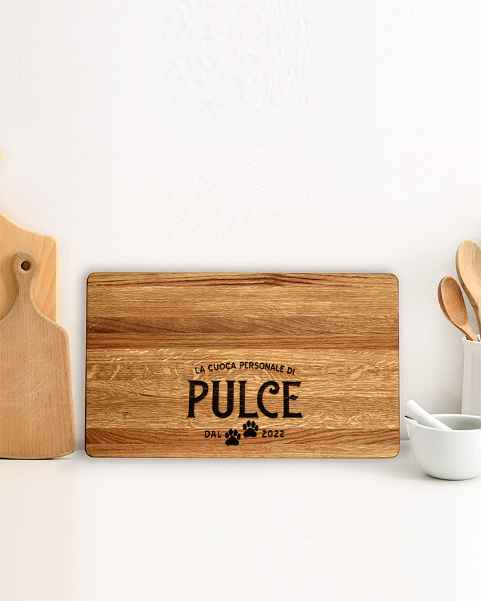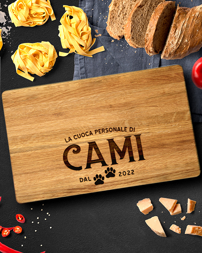 Simpatico Tagliere di legno personalizzato con un’incisione contenente la dedica che desideri e le impronte del cagnolino. Un regalo perfetto per il compleanno della tua amica o amico appassionato di cucina e di animali! Il tagliere è disponibile in varie dimensioni, tra legno di ciliegio e pregiatissimo rovere. Ideale per servire ottimi antipasti, portare in tavola le vostre pietanze o anche come decorazione originale ed unica per la cucina.