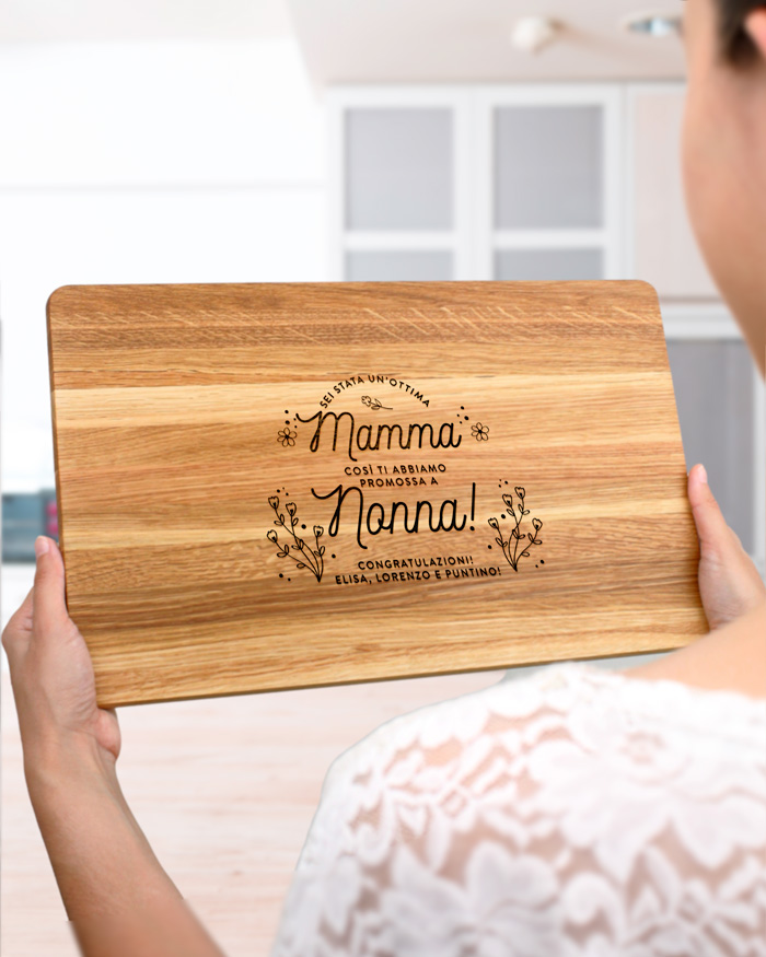 Meraviglioso Tagliere di legno personalizzato con una dedica incisa per la tua neo nonna. Un regalo perfetto per festeggiare la festa dei nonni con un pensiero unico! Il tagliere è disponibile in varie dimensioni, tra legno di ciliegio e pregiatissimo rovere. Ideale per servire ottimi antipasti, portare in tavola le vostre pietanze o anche come decorazione originale ed unica per la cucina.