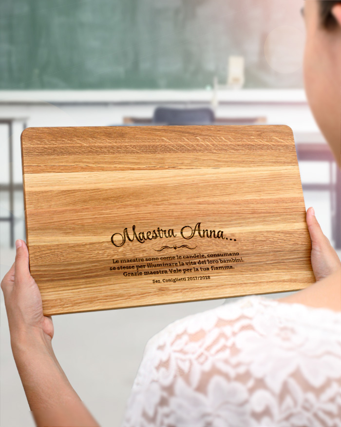 Tenero Tagliere di legno personalizzato con un’incisione contenente la dedica che desideri. Il regalo perfetto per ringraziare la maestra di tutto quello che fa per i bimbi! Il tagliere è disponibile in varie dimensioni, tra legno di ciliegio e pregiatissimo rovere. Ideale per servire ottimi antipasti, portare in tavola le vostre pietanze o anche come decorazione originale ed unica per la cucina.