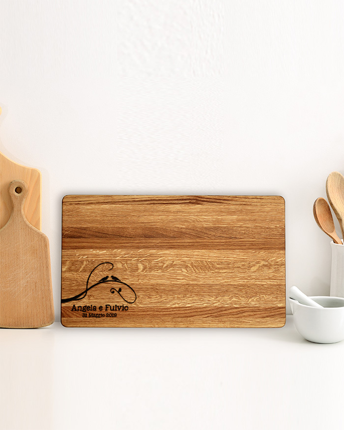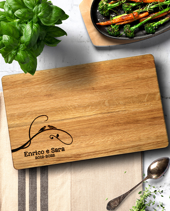 Romantico Tagliere di legno personalizzato con un’incisione con li vostri nomi e la data che desideri. Un dolce pensiero per festeggiare il vostro anniversario! Il tagliere è disponibile in varie dimensioni, tra legno di ciliegio e pregiatissimo rovere. Ideale per servire ottimi antipasti, portare in tavola le vostre pietanze o anche come decorazione originale ed unica per la cucina.