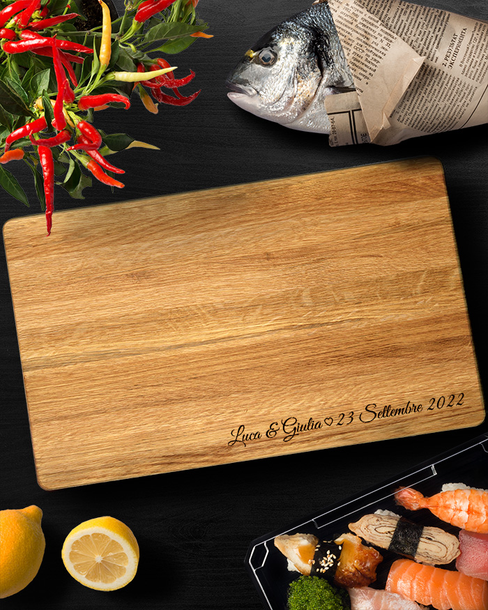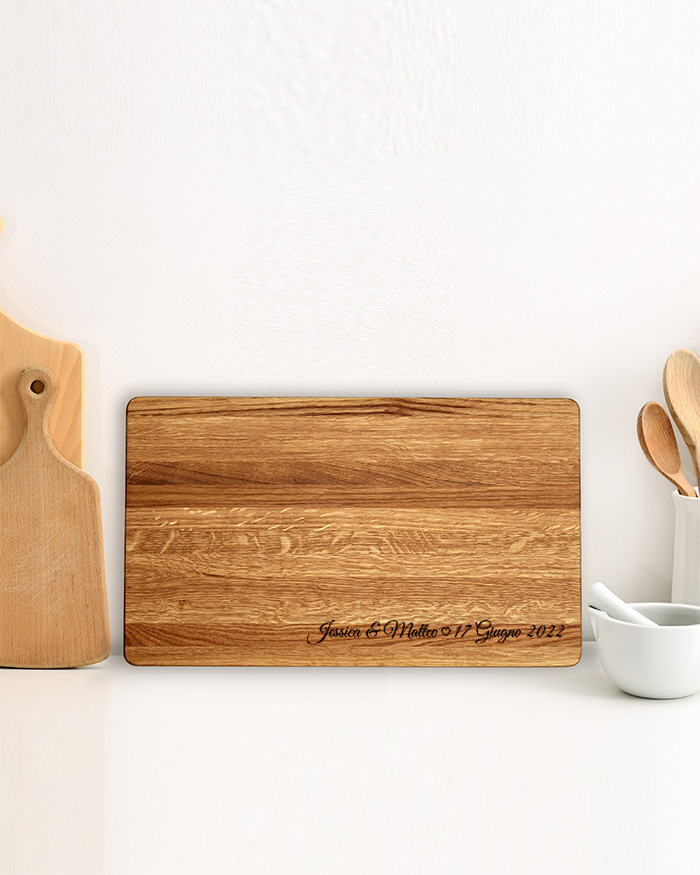 Stupendo Tagliere di legno personalizzato con i vostri nomi e la data. Un regalo perfetto per festeggiare un momento importante, come il matrimonio, San Valentino, Natale o il vostro anniversario! Il tagliere è disponibile in varie dimensioni, tra legno di ciliegio e pregiatissimo rovere. Ideale per servire ottimi antipasti, portare in tavola le vostre pietanze o anche come decorazione originale ed unica per la cucina.